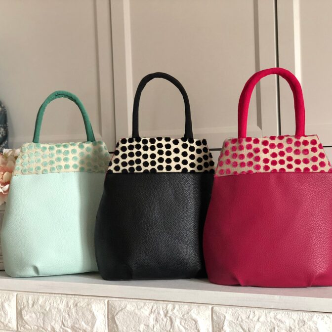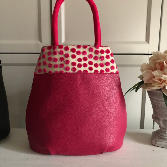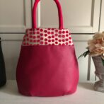 フランス製の可愛いドットの生地を上部に、そしてボディは国産の耐久性に強い合皮を使用し、底には汚れ防止で鋲を打っております。