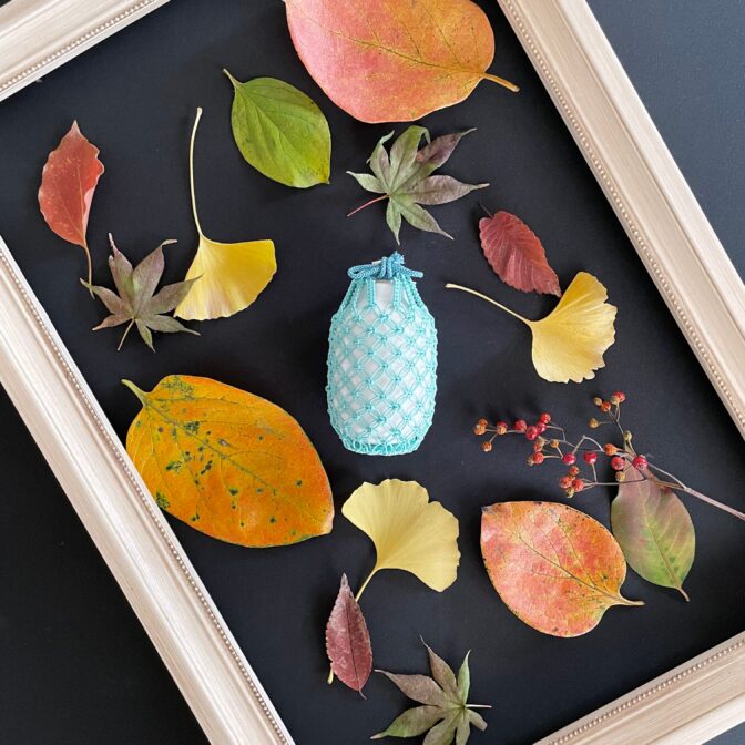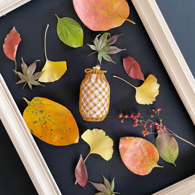 デンマークの小瓶を振出のお見立にし、それに合わせて網袋を仕立てました。